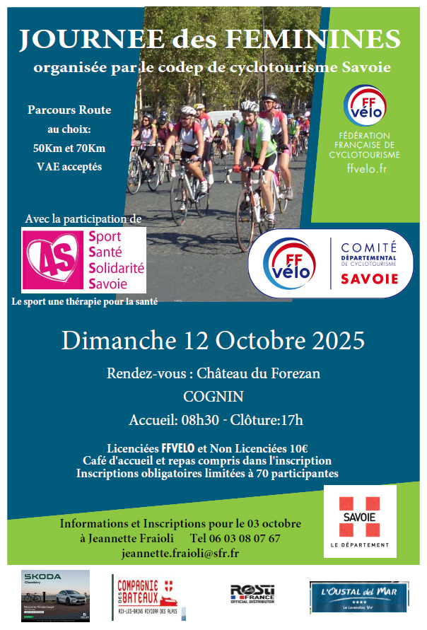 Le CoDep 73 organise sa journée « féminines » le 12 octobre 2025 au château du Forezan, 23 chemin du Forezan à Cognin.