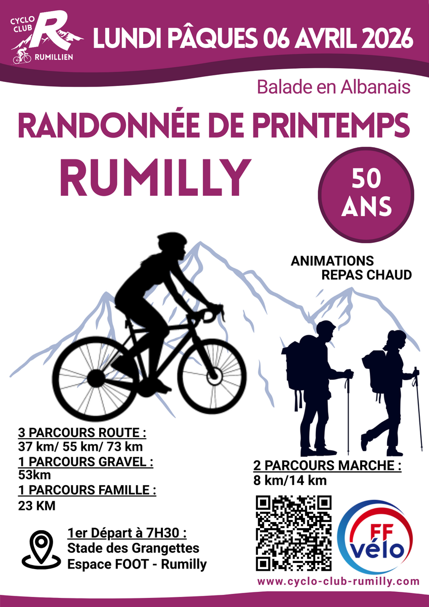 Lundi de Pâques 06 avril 2026, le Cyclo-Club Rumillien donne rendez-vous aux amateurs de vélo et de marche pour le retour, après deux années d’interruption, de sa « Randonnée de Printemps ».